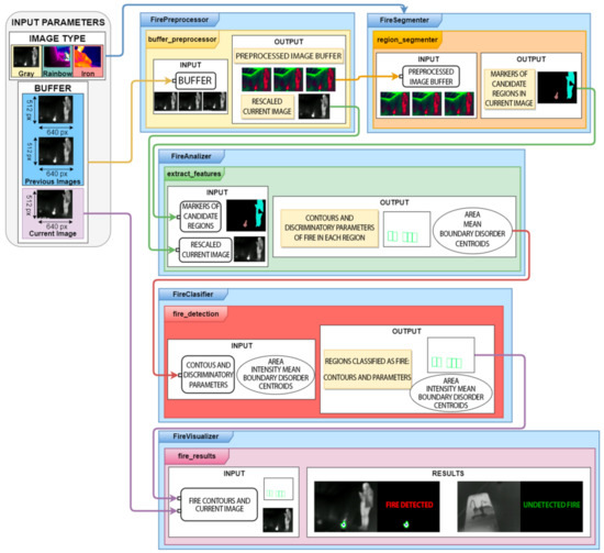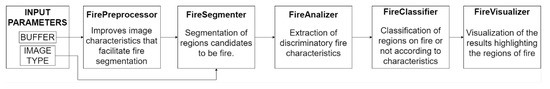 Regions meeting these conditions shall be considered as flames and shall be marked in the current input buffer image. In the last stage (FireVisualizer), the algorithm stores the characteristics of the regions classified as fire with their contours. These regions and contours are transferred to their representation.