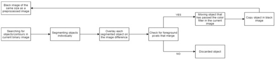 At this point, the elements of the buffer that have got this previous filter have been obtained. Temporal analysis is performed. This analysis will identify the objects that are presented in all the images. Moreover, it has been taken into account that the fire is a dynamic element. The hypothesis is that the next elements of the scene are static—the volume and movements do not change. Once the binary images are obtained from the color filter, Equations (2)–(4) describe the subtraction of images: