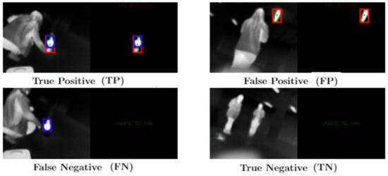 The metric used is important. Some works [38] in classification performance metrics were based on the binary confusion matrix. Below, the methodology to evaluate the results is explained. Firstly, we evaluate the accuracy of the process, detection metrics, and processing times. These were used as an evaluation metric. In a pattern recognition task, we needed to define the true positives and the false positives. We measured the accuracy of the flame detection at the region level and used the IoU (intersection over union) for our evaluation metrics. Their union divides the intersection of the detection result and ground truth, which is the detection accuracy. The following equation was used to calculate the IoU: