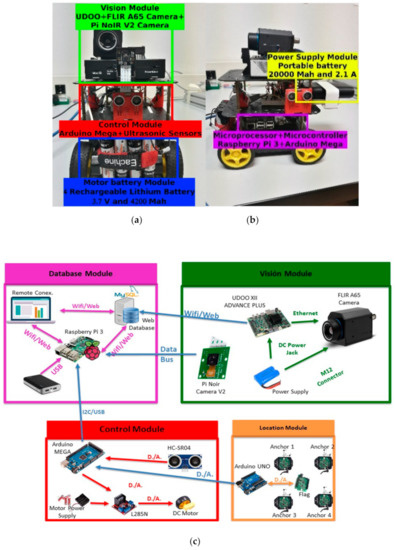 The data acquisition system also includes real-time video capture, environmental monitoring, and processing equipment coupled to the mobile ground autonomous vehicle (MGAV). The MGAV is based on [33] and uses three ultrasonic sensors to recognize the environment, with sonar operation controlled by an ATmega328P microcontroller. We include more sensors to improve navigation and acquisition. Figure 7a,b shows the components and deployment, and the connections between them are shown in Figure 7c. The MGAV can navigate within the confined enclosure without user interaction. It can monitor the environmental parameters to detect the focus of the emergency based on network deployment.