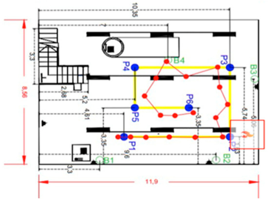 Figure 12 shows a map with the dimension of the confined space in the USC and the beacons’ location design. The gallery has three exits and two entrances, so it is important to define which one is closest to the fire.