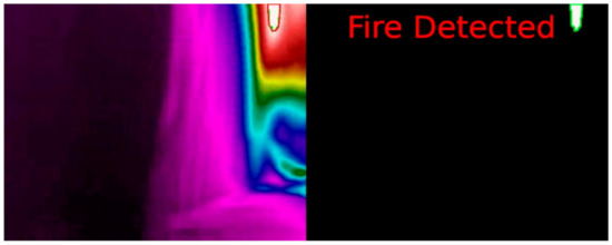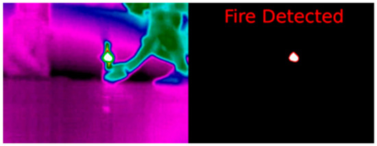 The system detect the location of the flame’s focus thanks to the models of the algorithm explained in the previous section. Nevertheless, with the increasing advance in neural networks applied over image processing, it is possible to train a deep neural network that is capable of detecting fire [15] in thermal images with our developed method, which improves the processing time and reduces the false positives below 1% and the false negatives below 2%. Although most solutions usually use RGB cameras, we successfully validated our indoor spaces algorithms with no visibility. Our algorithm allows us to detect the beginning of the emergency’s focus when the level of the fire is imperceptible using images with a high level of smoke. Moreover, most of the works make their proposed static and security cameras, making detection easier. However, in this work, we have deployed and evaluated the system using a moving camera.