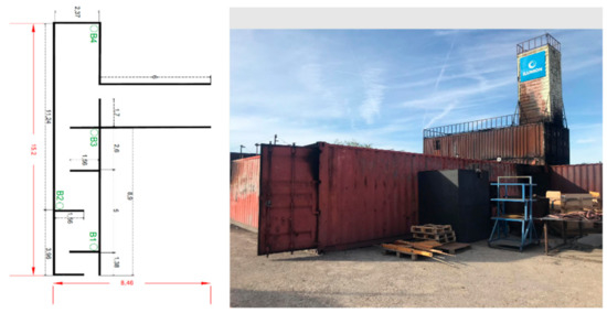 Representation of the MAP for the Teresa infrastructure evaluation and pictures of the scenario to prepare an intervention with real fire supervised by the Teresa group; the location is in Brunete (Madrid, Spain). On the left is a map showing the dimensions of the interior space, which also shows the deployment of the beacons. On the right, there is a picture of the outside.