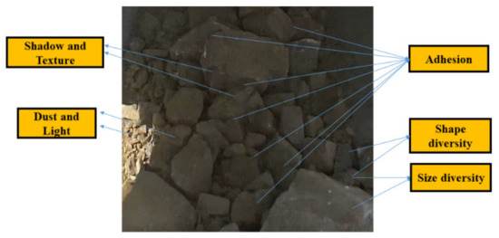 However, there are many obstacles to accurately segment ore images (e.g., the size and shape diversity of ores, the influence of dust and light, complex texture and shadows on the ore surface, and the adhesion between ores) as shown in Figure 1. Specifically, the adhesion between ores will cause the ore boundary to blur or even disappear, leading to under-segmentation.