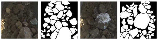 After obtaining binary images of the ore image labels, OpenCV was used to delete ore labels with pixels less than 2500, as segmenting tiny ores is not important, and labeling them is a harder and more time-consuming work than labeling normal ones. As for the CNN, the scale is one of the features that it can learn. Figure 2 shows two selected ore images and their annotation results.