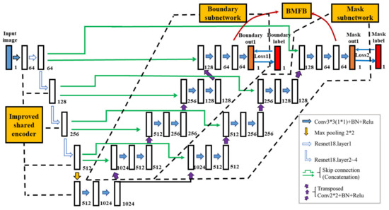 The boundary labels were obtained from mask labels by using the Canny edge detection algorithm in OpenCV. The simplified overall network architecture and the detailed BMFB are shown in Figure 5. Our decoder is different from [26], as their decoder was simply divided into two subnetworks without combining their information. Our decoder is also different from [27], whose idea was to use boundary information from the boundary subnetwork to help the BMFB obtain a more accurate mask segmentation.
