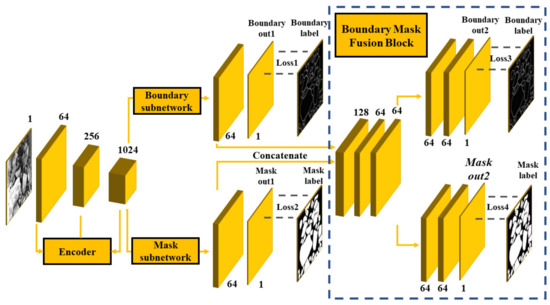 In contrast with the decoder of the original U-Net, our decoding path was divided into the boundary subnetwork, mask subnetwork, and boundary mask fusion block (BMFB). The boundary subnetwork was used to preliminarily detect the boundaries in ore images. The mask subnetwork was used to preliminarily predict the mask, and the last 64 feature maps of both subnetworks were sent to BMFB for feature fusion and the final mask prediction. Each subnetwork before BMFB was identical to the decoder of the original U-Net.
