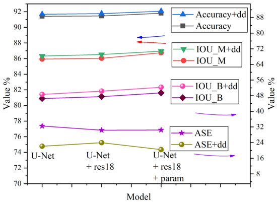 As can be seen from Table 3, compared with the original U-Net, the U-Net+VGG16 [35] and U+Net+Res18 [30] with our dd, which were already proved to be effective, did not improve in most performance metrics on the testing dataset, especially for the pixel accuracy and IOU_M. The U-Net+VGG16 [35] achieved the best effect in the precision, under-segmentation, IOU_B, and ASE.