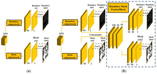 Although they integrate feature maps of two subnetworks, only the mask was predicted in their BMFB, meaning that information from the mask subnetwork was not helpful in boundary prediction. Inspired by [32,33], we considered that boundary information is as important as mask information. Thus, in our BMFB, we had two subnetworks for predicting the boundary and mask, respectively. Only the final mask out2 was used for testing.