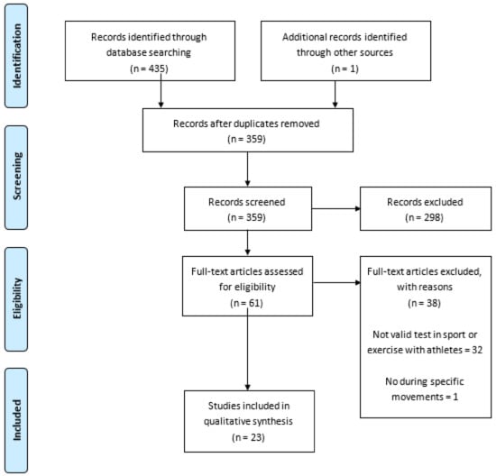 The searching of databases identified a total of 435 titles (Cochrane = 117; PubMed = 108; Scielo = 70; Web of Sciences = 140). In addition, one article was added from external sources. These studies were then exported to reference manager software (EndNoteTM X9, Clarivate Analytics, Philadelphia, PA, USA). The selection process can be observed in Figure 1.