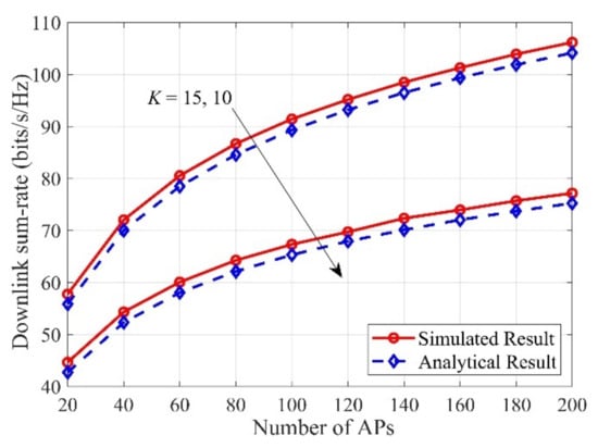 First, to verify the correctness of the theoretical deduction, based on the genie-assisted “Simulated Result” in (14) and the “Analytical Result” in (22), in Figure 1, a comparison about downlink sum-rate against the number of APs is presented. Typically, the “Simulated Result” is generated by using the Monte-Carlo method by averaging independent channel realizations. As can be readily observed, the “Simulated Result” exactly matches the “Analytical Result” for all considered cases, which confirms that our derived analytical results are effective and correct. In addition, we can easily find that the downlink sum rate grows with the number of APs. The reason for this observation is that large numbers of distributed APs can bring huge antenna gains to the system.
