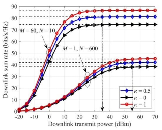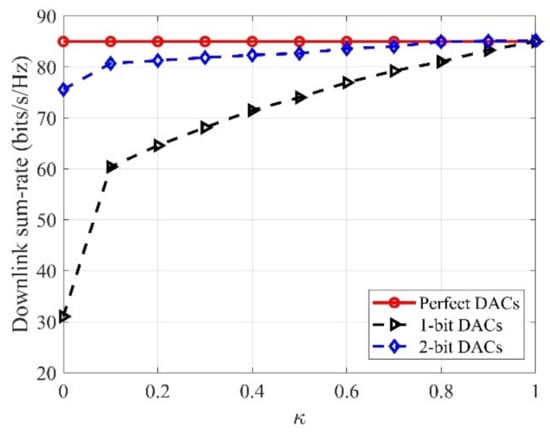 In Figure 5, the downlink sum-rate versus the for different quantization bits is described, with . From Figure 5 we see that, for the low-resolution DACs, the downlink sum-rate raises as the increases, especially for 1-bit DACs. The reason is that with the increased , the proportion of the perfect DACs is raised, and then the downlink rate of the system can be greatly improved.