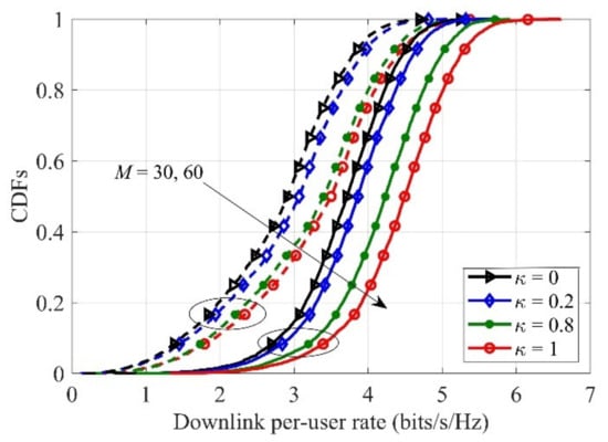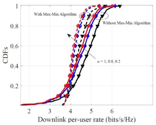 Last but not least, Figure 6 investigates the impact of the for the downlink per-user rate for the general fairness principle (), with , , . Along with the increase, the downlink per-user rate can be sharply enhanced and the gaps between different curves are decreased. The results show that when the system uses low-resolution quantization, increasing contributes to raising the system sum rate. Focusing on the general fairness principle, the achievable downlink rate is more concentrated around a certain value compared with the case without the max–min algorithm. This confirms that the proposed algorithm can guarantee uniform QoS.