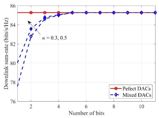 Figure 4 investigates the downlink sum-rate for the number of DAC bits for different . It is clear to see that when the DAC bit is less than 5 bit, increasing can effectively increase the downlink rate. However, when , the system performance will saturate. This means that, in this regime, -bit DACs can be used to replace perfect-resolution DACs without any performance loss. In addition, it can be seen that increasing the proportion of the perfect DACs can effectively improve the system rate.