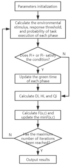 In the basic ant colony labor division model, ants will perform tasks in which environmental stimulus intensity exceeds their internal response threshold. In the traffic signal timing problem, different signal phases will increase or decrease the green time according to the traffic flow of each phase. Therefore, in the traffic signal timing problem, the signal phase can be regarded as different ants, and the traffic flow and green time of each phase can be regarded as the stimulus value of the external environment.