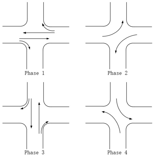The phase scheme of the traffic signal lamp includes the two-phase scheme, the three-phase scheme, the four-phase scheme and so on. In the four-phase scheme, the special left-turn phase is set in each direction. Compared with the two-phase scheme and the three-phase scheme, the conflict points are effectively eliminated and the traffic efficiency is improved when the road is busy, so this paper discusses the four-phase scheme, and its schematic diagram is shown in Figure 3.