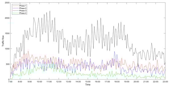 The data used in this paper come from “2020 China University computer competition · Huawei cloud big data challenge”, which describes the traffic situation at the intersection of Wuhe Avenue and Zhangheng Road in Longgang, Shenzhen. It intercepts the traffic flow at the intersection from 7 am to 11 pm on 12 January, 2020, and sets every five minutes as a unit time. Due to the excessive number of straight cars in all directions of the intersection, in order to eliminate the conflict points and reduce the possibility of accidents, the four-phase scheme is selected. After processing, the traffic flow at the intersection on that day is shown in Figure 4.