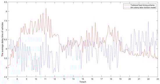 It can be seen from Table 1, Table 2 and Table 3 that compared with the traditional fixed timing scheme, the scheme optimized by the ant colony labor division model has significant improvement in the delay time of vehicles and the number of stops. The average delay time of vehicles in the traditional fixed timing scheme is 6.53 s, and in the optimized scheme is 5.86 s, which is 10.25% lower than that in the traditional fixed-timing scheme. The average number of stops in the traditional fixed timing scheme is 1.0314, and after optimization, it is 0.7782, which is 24.55% lower than that in the traditional fixed timing scheme. It can be seen that in terms of the average delay time of vehicles and the average number of stops, the results of the proposed optimization algorithm proposed in this paper are obviously better than those of the traditional fixed timing scheme.