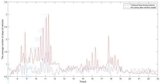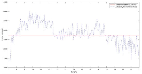From Figure 5, Figure 6 and Figure 7, it can be seen that in the period of busy traffic flow, such as 8:00–12:00 and 17:00–19:00, the average delay time and the average number of stops of vehicles after optimization are significantly reduced, and the intersection capacity is also significantly improved. According to calculation, during the period of 8:00–12:00, compared with the fixed timing scheme, the average delay time of vehicles is reduced by 22.01% in the timing scheme optimized by the ant colony labor division model, the average number of stops of vehicles is reduced by 40.92%, and the road capacity is increased by 24.37%. During the period of 17:00–19:00, the average delay time of vehicles is reduced by 12.46%, the average number of stops of vehicles is reduced by 25.29%, and the road capacity is increased by 9.92%. However, in the period after 20:00, due to the small traffic flow, the possibility of congestion is low, and the optimization effect of the algorithm is not obvious.