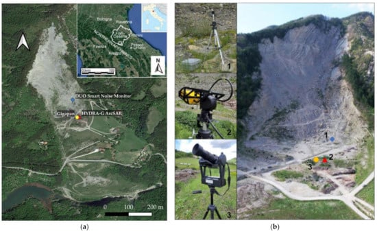 Operational ground-based remote sensing tools during the intensive monitoring campaign at Poggio Baldi Landslide Natural Laboratory (PBL): (a) Top view of the slope including the location of monitoring instruments. Upper right inset with enclose the geographical frame of the Forlì-Cesena province in the Northern Apennines; (b) UAV picture of the Poggio Baldi landslide upper slope and the corresponding positions of 01dB DUO Smart Noise Monitor (1), HYDRA-G ArcSAR (2) and GigaPan Epic Pro V system (3) about the rock cliff under study.