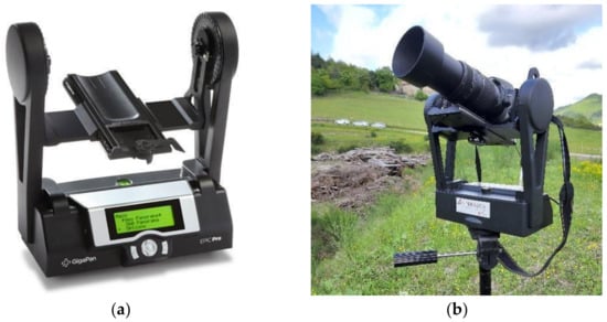Gigapixel identifies a digital image achieved by stitching technique, i.e., by merging several images acquired from the same position covering the whole view of interest. These digital images can be composed of billions of pixels or more (equal to or greater than 1000 Megapixels) [58,59,60]. As commercial DSLR cameras generally use sensors with more than 20 million pixels (20 Megapixels), to create a Gigapixel image it is required the use of tool like GigaPan EPIC PRO, produced by GigaPan Systems LLC [61]. GigaPan was created in 2008 by a research collaboration between NASA and Carnegie Mellon University to develop a high-resolution imaging technique for use in the Mars Exploration Rover mission. In short, the GigaPan system allows the sequential acquisition, using a robotic head (Figure 2), of hundreds of partially overlapped (40–80%) images, thus avoiding parallax errors. This result is achieved thanks to a robotic head mounted on a tripod that allows the rotation of the camera around the point of no parallax (NPP) [62,63]. The overlapping areas are exploited by the stitching software to determine the points of correspondence, from which starts the reconstruction of the image and the rearrangement of the pixels’ number. To date, this technique saw its greatest use in geosciences as a qualitative way for the representation and interpretation of high-resolution scenarios [64]. The use of Gigapixel images as raw data processed by innovative PhotoMonitoring techniques (e.g., using Change Detection algorithms) may represent an effective starting point for quantitative analysis for assessing and monitoring purposes. That means capturing high-resolution images over time from a fixed position and comparing them, thus performing a 2D Change Detection (2D-CD) [65,66,67].