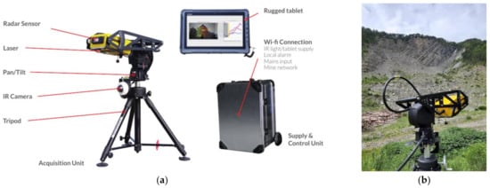 In the framework of the present study, a compact ArcSAR called HYDRA-G designed and manufactured by IDS GeoRadar (part of Hexagon) was used (Figure 3). Such an instrument is able to provide displacement measures with a sub-millimetre accuracy, by combining a very high phase measurement accuracy (<0.1 radians) and a short wavelength (4 mm) [55]. Its maximum range is about 800 m with a field of view up to 120° (horizontal) and 30° (vertical) and its operating temperature is −20 °C to +55 °C. The image resolution is 0.2 m in range and 14 mrad in cross-range. The maximum sampling interval is of about 30 s. The instrument is also equipped with an optical and infrared HD camera and with a short-range laser scanner in order to provide real-time images and to autonomously reconstruct the geometry of the monitored scenario.