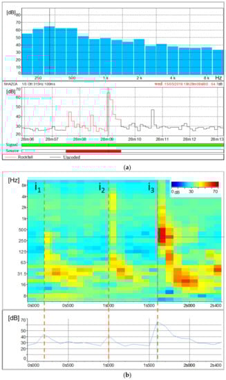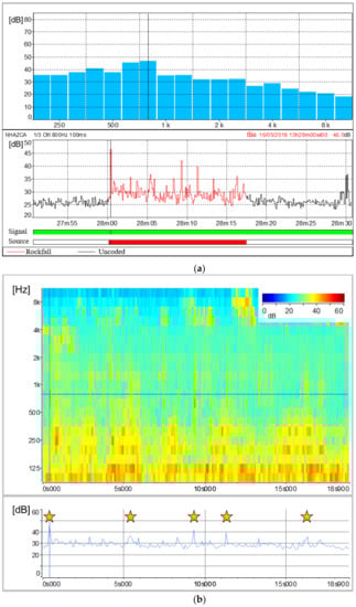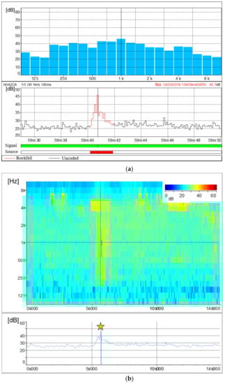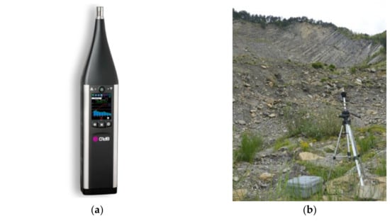 Regarding acoustic landslide monitoring, instantaneous sound pressure levels (dB) and spectra (Hz) have been recorded [94,95]. In this way we could analyse and classify them by using the proprietary software dBTrait 6 in post-processing LOG mode (Integrating Logging sound level meter), a kind of signal capture which includes the storage of time histories.