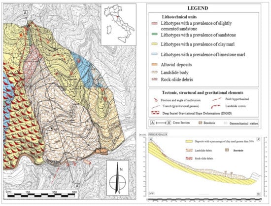 Geological map of the Poggio Baldi landslide area with a related cross-section along its body. The investigated rockfalls arise from the rock cliff outlined by the red dashed line and by the red box in the cross-section; modified from [47].