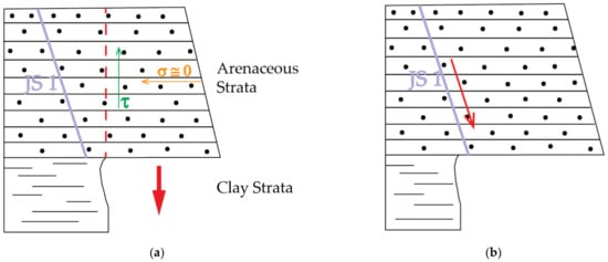 Conceptual model related to the two main triggering mechanisms of rockfall phenomena on the Poggio Baldi rock cliff: (a) Breaking of the arenaceous mass due to shear strength (τ) exceedance; (b) Failures due to planar sliding along the JS 1 discontinuity set.