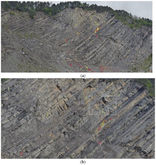 Gigapixel image with all rockfalls detected during the three days monitoring campaign: (a) 2D Change Detection (2D-CD) along the Poggio Baldi cliff with detached rock falls (yellow) and debris removal (red); (b) Zoom of the most active sector during the monitoring campaign.