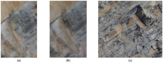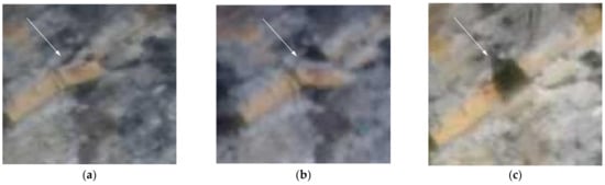 Evidence of precursory movements before the rockfall event as indicated by the withe arrow: (a) Zoomed Gigapixel image of 14 May 2019; (b) Zoomed Gigapixel image of 15 May 2019 with the tilted rock block; (c) Zoomed Gigapixel image of 17 May 2019 after the failure.