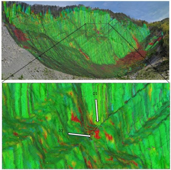 Following the data processing, all pixels containing the measurement information along the LOS (Radar-slope) were overlaid to a 3D model of the slope, generated by the instrument itself. Each pixel contains the cumulative displacement data of the 72 h of acquisition. As shown in Figure 10, the maximum cumulative displacement recorded during the 3-days monitoring by the ArcSAR instrument was about 5 mm (along LOS, approaching the sensor). The most active sector detected by the radar, displayed in red, was the debris talus located at the toe of the rock scarp with some portions bordering the scarp itself. In addition to the displacements recorded on the debris talus, a significant cumulative displacement of approximately 5 mm was identified in the central sector of the slope (Figure 11). According to the radar measurements, such areas (D1 and D2) suddenly moved between 14 and 15 May 2019.