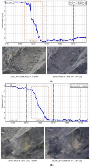 Comparison between radar measurements and Gigapixel analysis for D1 and D2 areas: (a) Displacement time series of D1 area measured by radar (above) and pre/post event images taken by GigaPan (below); (b) Displacement time series of D2 area measured by radar (above) and pre/post event images by GigaPan (below).