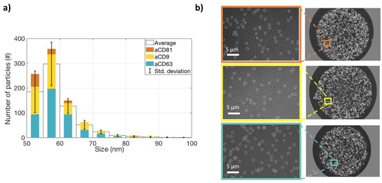 Label-free measurements of extracelluralar vesicles’ (EVs’ )shape and size distribution. (a) The size distribution of EVs captured on CD9, CD81, and CD63 spots. The colored bars represent the number of particles counted on each antibody spot. The white bars represent the average of the three antibodies, and the black lines show the standard deviation. (b) Label-free images of the particles on the three spots.