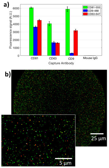 (a) The fluorescence signal obtained for the analyzed EVs from staining with three different labeled antibodies (aCD81-555, aCD9-488, aCD63-647), on three different capture spots (aCD9, aCD81, aCD63). (b) A co-localized fluorescence image of EVs captured on immobilized aCD9. Green points refer to CD81 staining, blue to CD9, red to CD63. The inset shows a zoomed-in image of the same spot.
