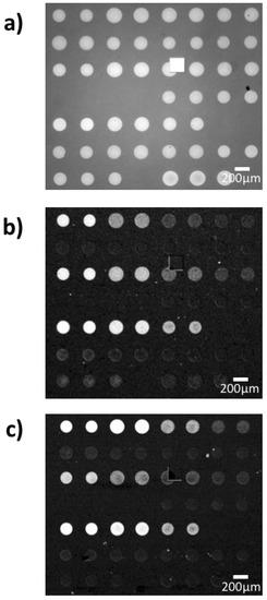 The probes for the binding kinetics IRIS experiments were spotted in a microarray modality, and an IRIS image of the chip prior to the experiment is reported in Figure 3a. As described in Section 2.5, to maintain a good spot conformation, the density of the active antibodies was tuned by keeping the same total concentration of the spotting solution (3 mg/mL) while varying the percentage of the active molecules. Therefore, even though the surface biomass density was maintained constant for all spots, resulting in similar intensities for all spots in Figure 3a, the percentage of active antibodies within each spot ideally should have changed linearly depending on the IgG1/IgG2 ratio. However, since the yield of the immobilization process is not ideal, the actual amount of active probe within each spot was measured through a control experiment, by flowing a generic IgG1 antibody across the surface of a chip belonging to the same spotting batch as the one used for the EVs detection experiment. A differential image of the IRIS chip after the control experiment can be observed in Figure 3b.