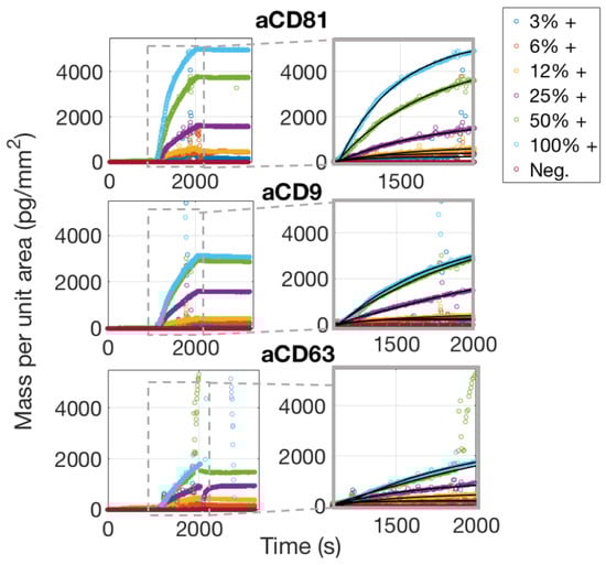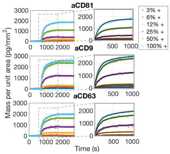 We successfully demonstrated a label-free, multiplexed method for the optimization of the experimental parameters related to EVs experiments. This method would potentially allow researchers in the field of EVs characterization to dramatically reduce incubation time for EVs experiments, as well as optimize surface probe density, type of probe, and other experimental parameters. Simultaneous acquisition of binding of EVs to many different probes at different concentrations allowed for affinity characterization of the antibodies. A simplified multivalent model was used to analyze and fit binding curves of EVs, as detailed in Section 4.2. As expected, high affinity of EVs to aCD81 was demonstrated and also confirmed by Single Particle Interferometric Imaging measurements.