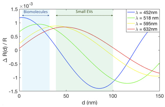 Figure 5 shows the change in reflectance signal in terms of the total reflectance () for a range of biomass accumulation (d) on an IRIS substrate with 110 nm of oxide. For this oxide thickness, the maximum change in reflectance signal is achieved using blue illumination ( = 452 nm) for small amounts of biomass accumulation (0–20 nm). Since the small EVs are 50 to 150 nm in diameter, their accumulation on the surface surpasses the thickness where blue is optimal. Instead, green illumination ( = 518 nm) shows a greater change in reflectance for this biomass accumulation range and was therefore chosen for these experiments.