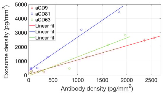 Correlation between the amount of active antibody immobilized on the surface and the total amount of captured EVs. The x coordinate of the data points corresponds to the maximum binding signal reached in Figure 4, while the y coordinate is the maximum EVs binding signal as shown in Figure 6. A linear correlation of the two datasets (no saturation) implies that—for this concentration range—the avidity regime does not change.