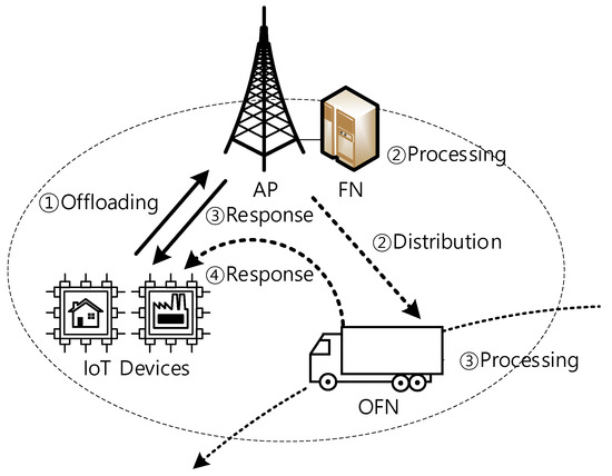 Figure 1 depicts the system architecture, where IoT devices offload tasks to FN and wait for a response. As shown in Figure 1, the offloading can be processed by either OFN or FN when OFN is available (or not) due to mobility. This paper assumes that OFN notifies its events of entering and leaving and reports current computing status to AP, based on the existing cellular registration mechanism [17].