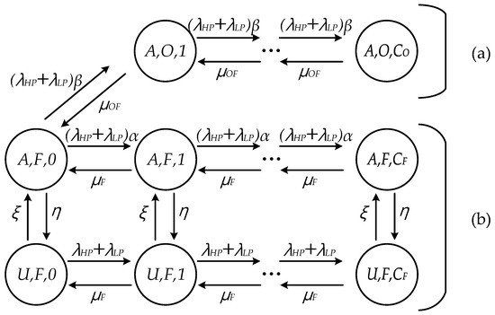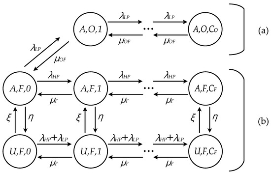 To develop an analytical model, this paper considers M/M/1 queuing models for fog computing architecture [10,17], where the request flows of HP and LP follow Poisson distribution with rates λHP and λLP. In addition, since the task sizes of the request flows are assumed to follow the exponential distribution, the service times of FN and OFN also follow the exponential distribution with mean of 1/μF and 1/μOF, respectively [9]. Figure 2 shows the Markov chain model of FN and OFN in the proposed scheme. In state (i, n, j), i represents the status of availability for OFN, n means the serving node to process the request, and j denotes the number of requests currently served by n. Each request can be served by either FN (F) or OFN (O), where CF and CO are the capacities of FN and OFN, respectively. Note that each FN (OFN) can have different values of CF (CO) depending on its own capability. Status A means that the offloading to OFN is available because it is located in the coverage of AP. On the other hand, OFN is unavailable at status U. The sojourn time of OFN at status A and U follows the exponential distribution with rates 1/η and 1/ξ, respectively [23,24,25]. In Figure 2, LP flows are only be offloaded to OFN at status A; to distributed the load of FN and HP, flows are processed by FN to reduce the latency. At status U, FN processes both HP and LP in a round-robin fashion because OFN is not available. This paper assumes that the requests from IoT devices within the range of AP are offloaded to FN or OFN connected directly with AP. Collaborative offloading with other APs and cloud [9,11] and prioritized processing even at status U, such as using priority queue allocation [26], will be one of our future works.