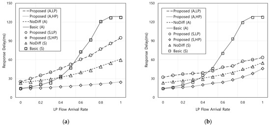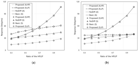 Figure 5 shows the response delay according to the ratio of HP flow arrival rate to LP flow arrival rate when the LP flow arrival rate is 0.5. Both η and ξ are set to 1/3 in Figure 5a and η and ξ are 2/3 and 1/3, respectively in Figure 5b. Figure 5 also shows similar trend with Figure 4 because the proposed scheme performs differentiated processing of HP flow requests. In Figure 5b, it can be noted that the effects of the proposed scheme can be reduced according to the ratio of HP and LP flow arrival rate. This also means that the impact of the differentiation between HP and LP flows becomes smaller. For example, the differences in response delay for the HP flows in the proposed scheme from that of NoDiff and LP flows in the proposed scheme are 12.9 ms and 21.5 ms when the ratio is 0.3, and 0.6 ms and 0.9 ms when the ratio is 1, respectively. This is because in the proposed scheme, the amount of HP flow requests to FN increases under the capacity constraint and the amount of LP flow requests processed by OFN is reduced owing to the lower sojourn time than that of Figure 5a.