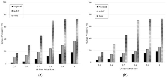 Figure 6 shows the outage probability (i.e., the ratio of the number of HP flow requests which do not satisfy the delay constraints to the total number of HP flow requests). Both η and ξ are set to 1/3 in Figure 6a and η and ξ are 2/3 and 1/3, respectively in Figure 6b. The delay constraint is assumed to be 30 ms. From Figure 6, outage probability increases according to the LP flow arrival rate because the system has a capacity constraint. However, the proposed scheme can have lower outage probability, which means a higher QoS satisfaction ratio compared to the conventional schemes because it preferentially handles the HP flow requests. As explained above, since the response delay of the proposed scheme becomes higher with increasing η, the outage probability also increases when comparing Figure 6a with Figure 6b. However, the proposed scheme still has lower outage probability compared to the conventional schemes because of the flow differentiation. Maintaining the outage probability below the specific value is an important performance metric from a network operator’s perspective.