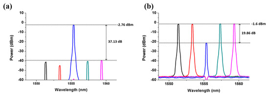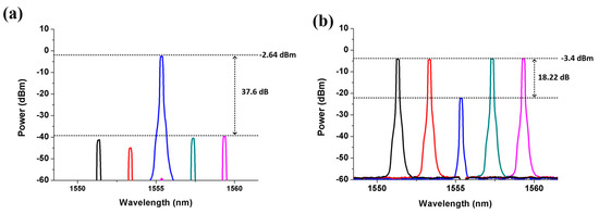 Figure 2a shows that five downstream optical carriers are fed into the new type SBOADM via I/O_P1 and I/O_P2 ports to evaluate the drop/add function of the proposal, and one upstream optical carrier is added in the SBOADM via Add/Drop_1 and Add/Drop_2 ports. Each downstream optical carrier has the same power of 0.06 dBm but there are different wavelengths whose center wavelengths are 1544.540, 1546.540, 1548.540, 1550.540 and 1552.540 nm. Each optical carrier is modulated with 1.2 Gbps/10 GHz radio-frequency (RF) signal via a Mach–Zender modulator. The third downstream optical carrier is also reused as an upstream optical carrier (as shown in Figure 2b) to simplify the experiment, and the Bragg wavelengths of the FBG1 and FBG2 are set at the same range of 1548.540 nm.