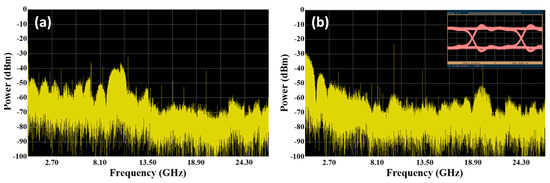 The five downstream signals and one upstream signal are respectively fed into the SBOADM from the I/O_P2 port and add/Drop_2 port to simulate the transmission of the optical signals in the CCW direction of a ring topology network. The optical spectra of the dropped and passed signals measured at the Add/Drop_2 and I/O_P1 ports are shown in Figure 6a,b, respectively. The power level of the non-dropped and dropped wavelengths are roughly −3.4 and −21.62 dBm to observe the passed signals shown in Figure 7b, resulting in 18.22 dB power variation amongst these wavelengths. Compared with the original signals shown in Figure 2a, the overall insertion loss for the non-dropped and dropped signals are 3.46 dB (0.06 − (−3.4) = 3.46) and 21.68 dB (0.06 − (−21.62) = 21.68), respectively. The power level of the target signal is reduced to −2.64 dBm whilst the values of the non-target signals are reduced to around −40 dBm to observe the optical signals at the Add/Drop_2 port. Roughly 37.6 dB power deviation is present amongst these signals. This power deviation is mainly caused by the frequency response of the FBG2 inside the SBOADM. The carried RF signal can be properly converted back to the electrical domain because the power of targeted signals is substantially larger than that in non-targeted signals. The observed electrical spectra of the received RF and frequency down-converted signals and the eye diagram are shown in Figure 7a,b, respectively. The obtained eye diagram is as clear as that shown in Figure 4b. This finding proves that the proposed SBOADM can always drop down target optical signals either via the I/O_P1 port or I/O_P2 port. Similar to previous scenarios, the upstream optical signal will be routed to the I/O_P2 port when it is uploaded from the Add/Drop_2 port. The optical spectrum measured at the I/O_P2 port is shown in Figure 8a, and the electrical spectrum and eye diagram of the obtained uplink signal after PD detection and frequency down-conversion are shown in Figure 8b. Although the added optical signal suffers 3.62 dB (0.06 − (−3.56) = 3.62) insertion loss compared with the original input optical signal, the modulated upstream RF signal is also properly received and measured.
