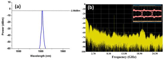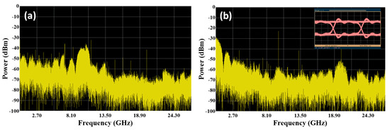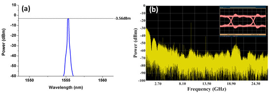 With the rapid development of science and technology, a variety of network applications, such as 5G communications, have emerged. The number of base stations (BSs) must be dramatically boosted to support the increased network capacity in the same network coverage range, and the stability of network transmission and reliability need to be enhanced. Radio over fiber (RoF) transport systems are suggested as an ideal broadband wireless network solution to support such a scenario because of their superior characteristics, such as high-frequency bandwidth, low attenuation and resistance to electromagnetic interference [1,2,3]. Therefore, numerous investigations on fiber 5G convergent systems [4,5,6] have been developed to overcome the limitations of shortening the transmission distance due to the increase in data transmission bandwidth in wireless communication [7].