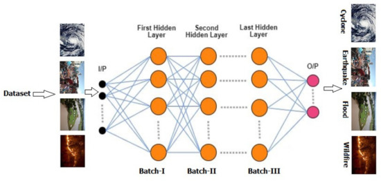 In our research, the dataset used was collected from PyImage Search readers, who used Google Images to collect the total number (4428) of images in different classes. The dataset was separated into four classes: cyclone, earthquake, flood and wildfire, with 928, 1350, 1073 and 1077 images, respectively, as shown in Figure 3. The dataset was preprocessed to remove the noise by using an adaptive histogram equalizer. The whole dataset was divided into three groups: training, testing and validation. In total, 60% of the dataset was used for training, 23% for testing and 17% for validation. These percentages of the dataset were used to inform the machine on the percentage values of the dataset to be used for testing, training and validation purposes. The validation set was used to count the number of epochs for the whole training process. The details of the dataset are shown in Table 4.