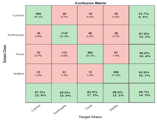 4-Class matrix of natural disasters classification by using the proposed method on the testing dataset.