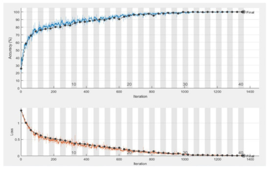 According to block-I of the convolutional neural network, only a detection process occurred in this phase. However, this block also consists of three small batches having four layers each. Moreover, an image input layer and fully connected layers are present. Additionally, some parameters are also defined with learning rate 0.001 and epoch size 40. On the other hand, the convolutional layers use a filter size of 3 × 3, stride 1 and eight filters that increase in number from 16 to 32 for the second and third minibatches of convolutional neural networks, as shown in Table 2 and Figure 2.