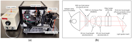 In this study, a light source that can perform OTN-NIR multispectral imaging was developed. In Figure 1a, the developed light source able to select the output wavelength manually using an NIR bandpass filter is shown. The light source was constructed with a cold mirror (CLDM-25.4C3.3, SIGMA KOKI, Tokyo, Japan), a 1500 nm shortpass filter (#84654, Edmund Optics, Barrington, NJ, USA), two achromatic lenses (AC254-030-C and AC254-035-C, Thorlabs, Newton, NJ, USA), and an off-axis parabolic mirror (MPD119-P01, Thorlabs, USA) based on a 150 W halogen lamp (JCR15V150WS and LA-150UE, HAYASHI-REPIC CO., LTD., Tokyo, Japan). The filter holders (CFS1/M, Thorlabs, USA), inserted in the light source, enabled the selection of the output wavelength. The optical system, modeled using the CODEV optical ray-tracing software, is shown in Figure 1b. As the selectable filters, 14 wavelength (1000–1400 nm) filters that were commercially available are listed in Table 1. For filters below 1150 nm, a 1250 nm shortpass filter was added because transmitted light was observed in the region over 1400 nm.